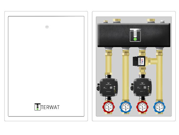 Układ hydrauliczny w szafce stalowej malowanej proszkowo na kolor biały lub grafitowy do wyboru przy zamówieniu. W opcji ramka maskująca umożliwiająca estetyczny montaż podtynkowy. Dla ułatwienia szafka daje możliwość zdjęcia obudowy i montażu na ścianie tylko panelu z układem hydraulicznym (odpinane plecy). Wariant posiada 1 obieg bezpośredni oraz 1 obieg z podmieszaniem - zawór termostatyczny 20-55°C (Kvs 3,4) ESBE.