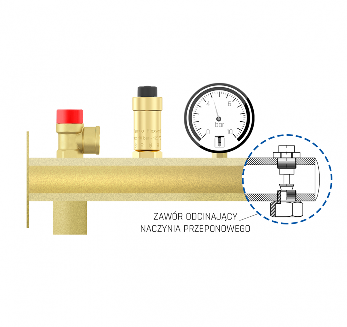 Grupa bezpieczeństwa do CO 1,5 bar - oparta na belce mosiężnej z uchwytem ściennym, zintegrowany zawór odcinający naczynia przeponowego.